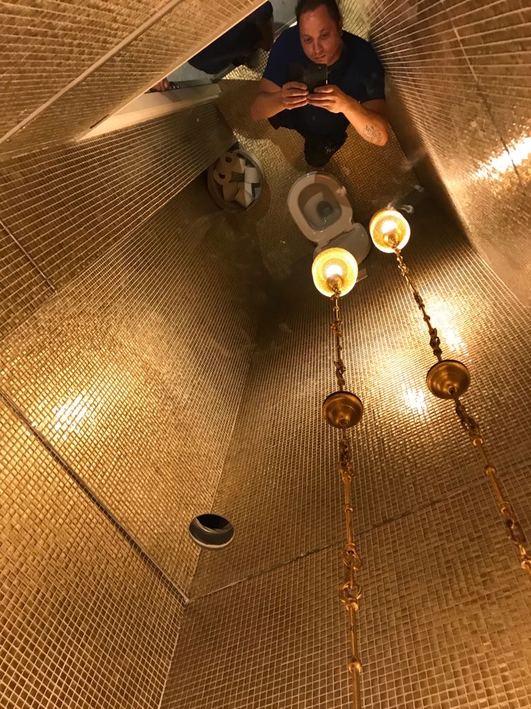 De goud gekleurde spiegel geeft de ruimte een luxe sfeer. Erg mooi in bijvoorbeeld een modern interieur met veel zwart en gouden accenten.